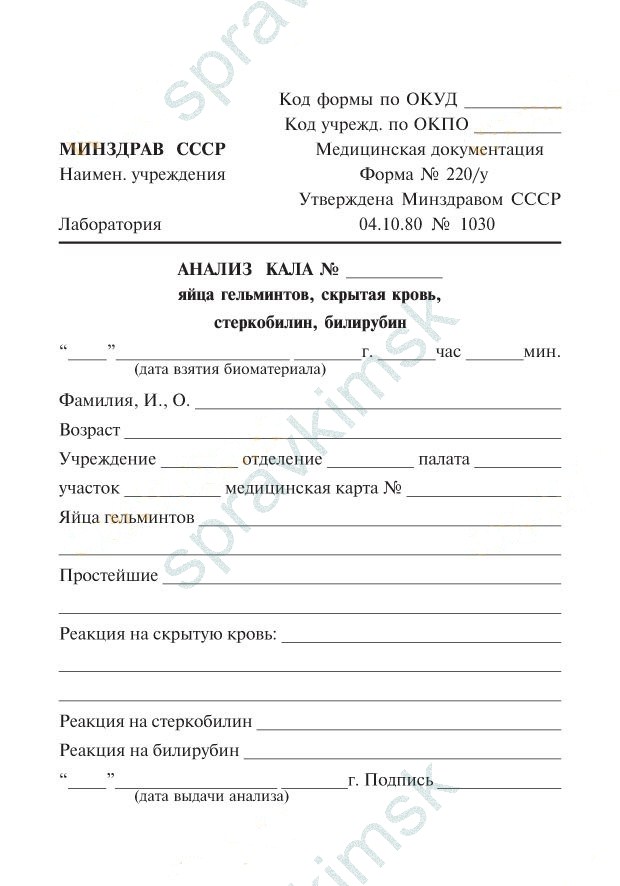 Справка 220/у это медицинский документ о результатах анализа кала по форме 220/у, который проводят с целью выявления яиц гельминтов, билирубина, стеркобилина и скрытой крови. Предоставление медсправки по указанной форме является обязательным в случаях: