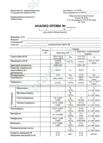 Это медицинский бланк, содержащий сведения о результатах сданного ОАК. Данный анализ отличается информативностью и благодаря значительному количеству исследуемых показателей, позволяет сделать системную оценку состояния здоровья пациента. В число определяемых в процессе анализа крови показателей входят: